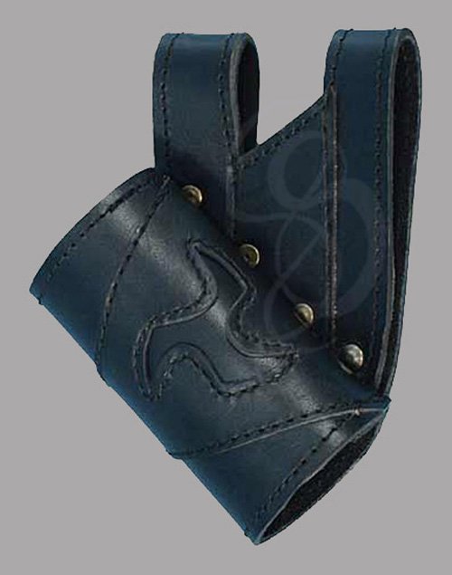 This leather sword frog will securely hold your LARP sword, dagger and even some axes at your waist, making drawing your weapon very convenient. The frog slides on to any belts up to 1 3/4" wide and has a 2" diameter so it will hold a variety of weapons. The LARP Celtic Triskel Sword Frog has a ancient looking Triskel symbol sewn on to the front, perfect for Celtic warrior characters. Available in right hand draw (frog will be on your left side).